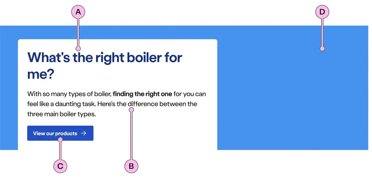 B | Content | A single, short paragraph works best. Can contain bold copy <b> , inline links <a> and a caveat at the end of the relevant paragraph if required <a href="#caveat">1</a> . |